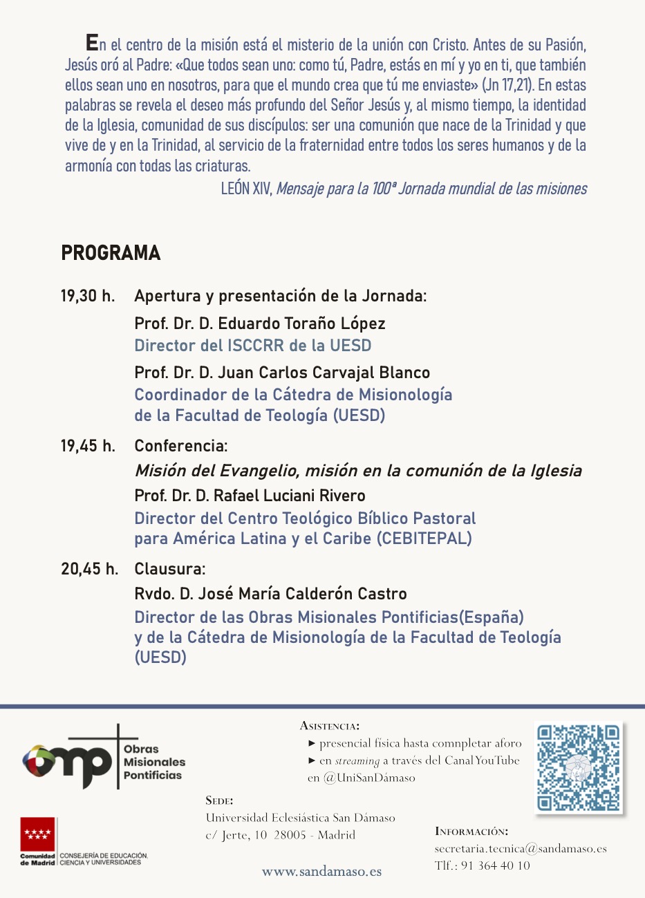El profesor Dr. D. Rafael Luciani, director del Centro Teológico Bíblico Pastoral para América Latina y el Caribe, nos acercará a esta realidad de la misión de la Iglesia.